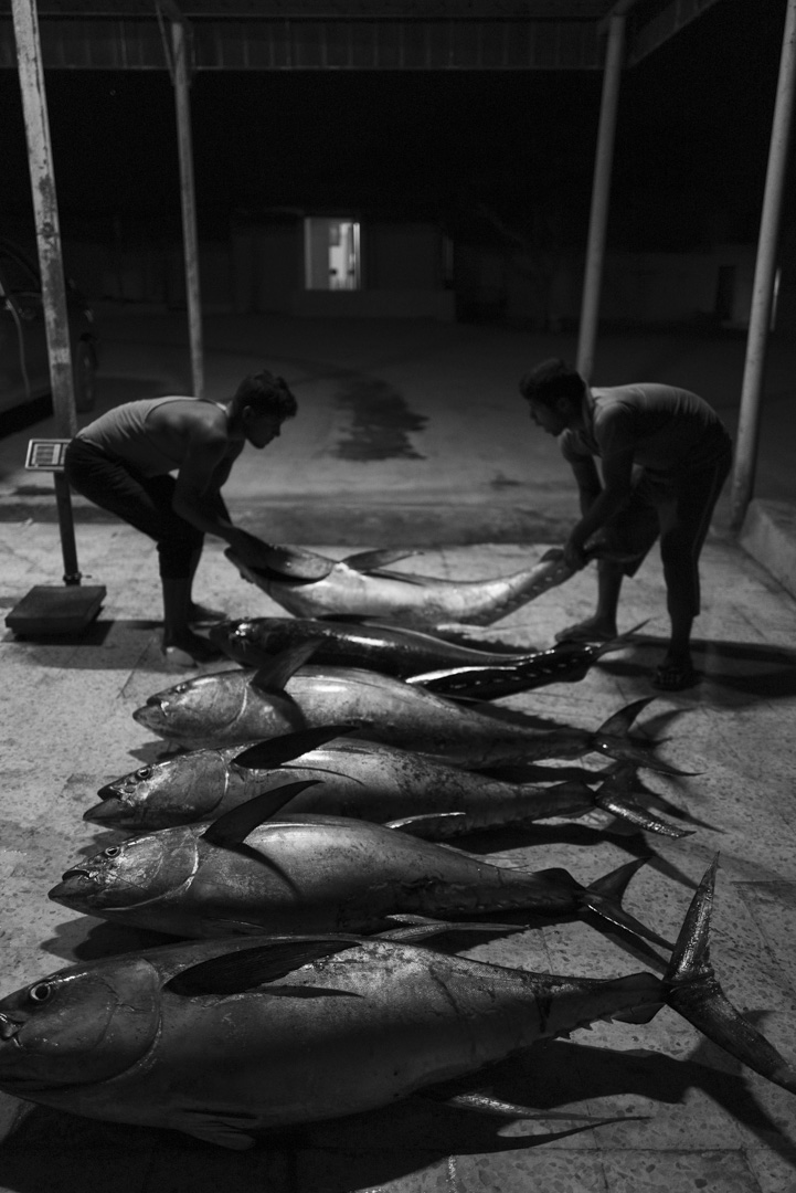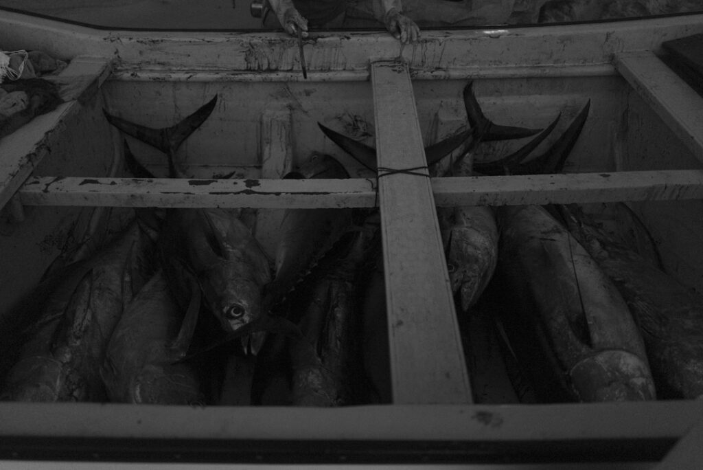 Der Tag beginnt früh morgens um 4 Uhr. Der Thunfisch wird ohne Netz aus einer Tiefe von 80 Metern gefangen. Um die exakte Tiefe, in der sich die Thunfische aufhalten, zu ermitteln, werden die schwarzen Angelschnüre in Abständen von jeweils zehn Metern mit weißen Markierungen versehen. Anhand der Kennzeichnung lassen sich weitere Thunfische in entsprechender Tiefe ködern. Für die Köder werden kleinere Fische mit einer Länge von etwa 15 cm an einen eckigen, recht klobigen Stein geschnürt, der sich im Magen der fünfzig bis achtzig Kilogramm schweren Thunfische verkeilt. Nur dadurch lassen sie sich aus der Tiefe des Meeres ans Boot zu ziehen, um sie daraufhin mit vereinten Kräften unter Deck zu verstauen.